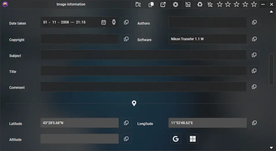 If the GPS coordinates are saved on the image, you can click the Google or Bing buttons to open the respective maps at the GPS coordinates.